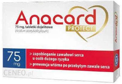 Anacard Protect to lek zawierający substancję czynną – kwas acetylosalicylowy. Jest to produkt leczniczy stosowany u pacjentów z chorobami, które stwarzają zagrożenie tworzenia się zakrzepów oraz zatorów w naczyniach krwionośnych. Skład: 1 tabletka zawiera: substancję czynną: kwas acetylosalicylowy – 75mg oraz substancje pomocnicze: celuloza mikrokrystaliczna, krzemionka koloidalna bezwodna, skrobia żelowa kukurydziana, talk, hypromeloza, tytanu dwutlenek (E171), triacetyna, kwasu metakrylowego i etylu akrylanu kopolimer, trietylu cytrynian, sodu wodorowęglan, sodu laurylosiarczan. Działanie: Kwas acetylosalicylowy zawarty w produkcie hamuje agregację płytek krwi. Jest to kluczowe przy chorobach serca oraz w sytuacjach klinicznych, które mogą prowadzić do zatorów i zakrzepów. Zastosowanie: Lek wskazany do długotrwałego stosowania w profilaktyce chorób układu krążenia, które mogą powodować zakrzepy i zatory w naczyniach krwionośnych, czyli n.p zawał serca. Do stosowania także w profilaktyce innych chorób przebiegających z zakrzepami w naczyniach. Informacje dodatkowe: Lek należy przechowywać poza zasięgiem dzieci. Przeciwwskazania: Nie stosować w przypadku uczulenia na: kwas acetylosalicylowy, którykolwiek składnik leku, inne NLPZ (uczulenie z objawami takimi jak: skurcz oskrzeli, wstrząs, katar sienny). Nie stosować w przypadku: astmy oskrzelowej, przewlekłych schorzeń układu oddechowego, gorączki siennej, obrzęku błony śluzowej nosa. Nie stosować u pacjentów, u których występuje: choroba wrzodowa żołądka i/lub dwunastnicy, stany zapalne lub krwawienia z przewodu pokarmowego; ciężka niewydolność wątroby, nerek, serca; zaburzenia krzepnięcia krwi (nie stosować także przy równoczesnym zażywaniu środków przeciwzakrzepowych); niedobór dehydrogenazy glukozo-6-fosforanowej. Nie stosować u pacjentów, którzy otrzymują metotreksat w tygodniowej dawce 15mg lub większej. Przeciwwskazaniem jest wiek (poniżej 12 roku życia) oraz ostatni trymestr ciąży. Działania niepożądane: Podczas stosowania leku mogą pojawić się objawy niepożądane: zaburzenia żołądka i jelit, zaburzenia wątroby i dróg żółciowych, zawroty głowy i szumy uszne, zaburzenia słuchu, zaburzeni nerek i dróg moczowych, niewydolność serca, nadciśnienie tętnicze, zaburzenia krwi i układu chłonnego, zaburzenia układu immunologicznego. Długotrwałe zażywanie leków z kwasem acetylosalicylowym może powodować bóle głowy. Dawkowanie: Przyjmować doustnie. Lekarz ustala dawkowanie. Zaleca się przyjmować tabletki w czasie posiłku lub po jego zakończeniu, popijać niewielką ilością wody. Zwyczajowa dawka dobowa to 1 tabletka Anacard Protect 75mg. W przypadku świeżego zawału serca lub jego podejrzenia należy zażyć jednorazową dawkę – 4 tabletki i dokładnie rozgryźć dla uzyskania szybkiego wchłaniania.