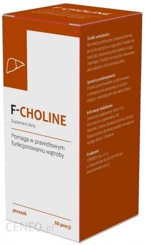 F-CHOLINEilość porcji: 60Suplement diety F-CHOLINE zawiera cholinę w formie proszku.SKŁAD PRODUKTUPorcja dzienna 0,7 g zawiera (referencyjna wartość spożycia %):•Wodorocytrynian choliny- 700 mg,•w tym: cholina- 245 mg.Składniki: cholina (wodorocytrynian choliny).Zawartość opakowania netto: 42 g.Ilość porcji w opakowaniu: 60.SPOSÓB UŻYCIA1. Wsypać 1 porcję (1 płaska miarka) do suchego naczynia.2. Dodać 200 ml wody lub innego napoju i wymieszać.Uwaga- należy zachować kolejność przygotowania, aby dokładnie rozpuścić proszek. Spożyć 1 razdziennie w trakcie posiłku. Przed spożyciem energicznie wstrząsnąć pojemnik.ŚRODKI OSTROŻNOŚCINie należy przekraczać zalecanej dziennej porcji do spożycia w ciągu dnia. Produkt nie może byćstosowany przez kobiety w ciąży, karmiące i dzieci bez konsultacji lekarskiej. Produkt nie może byćstosowany jako substytut zróżnicowanej diety. Nie stosować w przypadku uczulenia na którykolwiek zeskładników. Zalecamy zrównoważony sposób żywienia i zdrowy tryb życia.DZIAŁANIECholina pomaga w prawidłowym funkcjonowaniu wątroby. Przyczynia się do utrzymania prawidłowegometabolizmu tłuszczów oraz homocysteiny.Cholina jest to związek zasadowy odkryty w latach trzydziestych XX wieku. Dawniej zaliczana była dogrupy witamin B. Cholina jest składnikiem wielu fosfolipidów, w tym lecytyny. Źródłem choliny są: żółtkajaj, wątroba i inne podroby, chude mięso, drożdże, warzywa strączkowe, mleko, soja i ziarna zbóż,a zwłaszcza kiełki pszenicy.Funkcje choliny:Cholina jest składnikiem fosfatydylocholiny występującej w lecytynie. Fosfatydylocholina zapobiegaodkładaniu się tłuszczu i cholesterolu w wątrobie. Zwiększa rozpuszczalności cholesterolu, dziękiczemu usprawnia jego metabolizm. Tym samym przyczynia się do zminimalizowania ryzyka jegoodkładania w ścianach naczyń krwionośnych i pęcherzyku żółciowym. Wiele badań wykazuje, żesuplementacja choliną jest pomocna w leczeniu różnych schorzeń wątroby. Pozytywnie wpływa równieżna prace nerek, regulując ilość wydalanego moczu. Cholina jest potrzebna do produkcjineuroprzekaźnika o nazwie acetylocholina, który między innymi bierze udział w procesachodpowiadających za nastrój i pamięć. Cholina jest składnikiem błon komórkowych i jest niezbędna dowytwarzania i utrzymania w dobrym stanie osłonek mielinowych, chroniących komórki nerwowei zapewniających właściwe przewodzenie nerwowe. Jest niezwykle ważna w okresie ciąży, gdyż płódpobiera przez łożysko duże jej ilości powodując obniżenie zapasów ustrojowych matki.Cholina:- przyczynia się do utrzymania prawidłowego metabolizmu homocysteiny,- przyczynia się do utrzymania prawidłowego metabolizmu tłuszczów,- pomaga w prawidłowym funkcjonowaniu wątroby.Wskazania do suplementacji choliny:-przy leczeniu chorób wątroby,-przy skłonności do kamicy pęcherzyka żółciowego,-przy zaburzeniach układu nerwowego związanych z niskim poziomem acetylocholiny w mózgu ,-przy niezdolności do uczenia się,-przy opóźnieniu funkcji motorycznych.