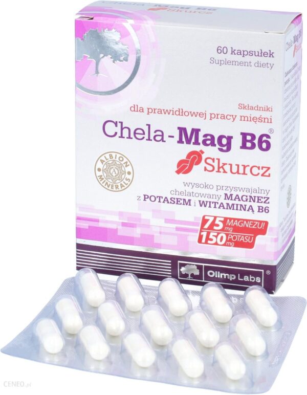 Olimp Chela-Mag B6 SkurczPreparat przeznaczony: do stosowania jako suplement diety ułatwiający pokrycie zapotrzebowania organizmu na magnez i potas – składniki korzystnie wpływające na prawidłowe funkcjonowanie mięśni, co zapobiega ich nadmiernym skurczom.DLA PRAWIDŁOWEJ PRACY MIĘŚNI!Chela-Mag B6® skurcz zawiera wysoko przyswajalną formę magnezu – w postaci chelatu aminokwasowego Albion® (diglicynian magnezu) i wysoko przyswajalną formę potasu (cytrynian potasu), korzystnie wpływające na prawidłowe funkcjonowanie mięśni, a wraz z zawartą witaminą B6, wspomagające prawidłowe funkcjonowanie układu nerwowego.Badania naukowe udowodniły, że:magnez jest składnikiem mineralnym niezbędnym do życia, biorącym udział niemalże we wszystkich procesach zachodzących w organizmie. Pierwiastek ten jest zaangażowany w prawidłowe funkcjonowanie mięśni, wpływa także na prawidłowe funkcjonowanie układu nerwowego, utrzymanie równowagi elektrolitowej oraz syntezę białek. Wykazuje pozytywny wpływ w redukcji zmęczenia i znużenia. Jego obecność jest również niezbędna w utrzymaniu prawidłowej budowy kości i zębów.witamina B6 uczestniczy w absorpcji magnezu z przewodu pokarmowego oraz współpracuje z magnezem w przebiegu wielu procesów zachodzących w organizmie.potas pełni istotną rolę w pracy mięśni oraz funkcjonowaniu układu nerwowego. Wpływa także na utrzymanie prawidłowego ciśnienia krwi.Badania naukowe potwierdzają wyższość chelatu aminokwasowego magnezu Albion® nad nieorganicznymi źródłami tego pierwiastka.Badanie in vitroPrzyswajalność magnezu z diglicynianu jest kilkukrotnie wyższa niż ze związków nieorganicznych jak tlenek, siarczan, węglanŹródło: MAGNESIUM: Wide Spread Benefits. Albion Research N otes 1992: Volume 1, No.2Pamiętaj! Wybierając preparat mineralny, szukaj na opakowaniu znaczka Albion® Minerals – to gwarancja najwyższej przyswajalności i biodostępności składników mineralnych.Skład:Składniki: diglicynian magnezu (chelat aminokwasowy magnezu ALBION®), cytrynian potasu, celuloza mikrokrystaliczna – substancja wypełniająca, tlenek magnezu, stearynian magnezu – substancje przeciwzbrylające, chlorowodorek pirydoksyny – wit. B6, kapsułka (żelatyna – składnik otoczki, barwnik: E 171).Informacja żywieniowa 1 kapsułka 2 kapsułkiMagnez 75 mg (20%*) 150 mg (40%*)Potas 150 mg (7,5%) 300 mg (15%*)Witamina B6 0,7 mg (50%*) 1,4 mg (100%*)*%ZDS– procent realizacji zalecanego dziennego spożycia.Dawkowanie:Zalecana dzienna porcja: 1 kapsułka 2 razy dziennie po posiłku lub inaczej po konsultacji z lekarzem.Nie należy przekraczać zalecanej dziennej porcji do spożycia w ciągu dnia. Suplement diety nie może być stosowany jako substytut zróżnicowanej diety. Zalecany jest zrównoważony sposób żywienia i zdrowy tryb życia.