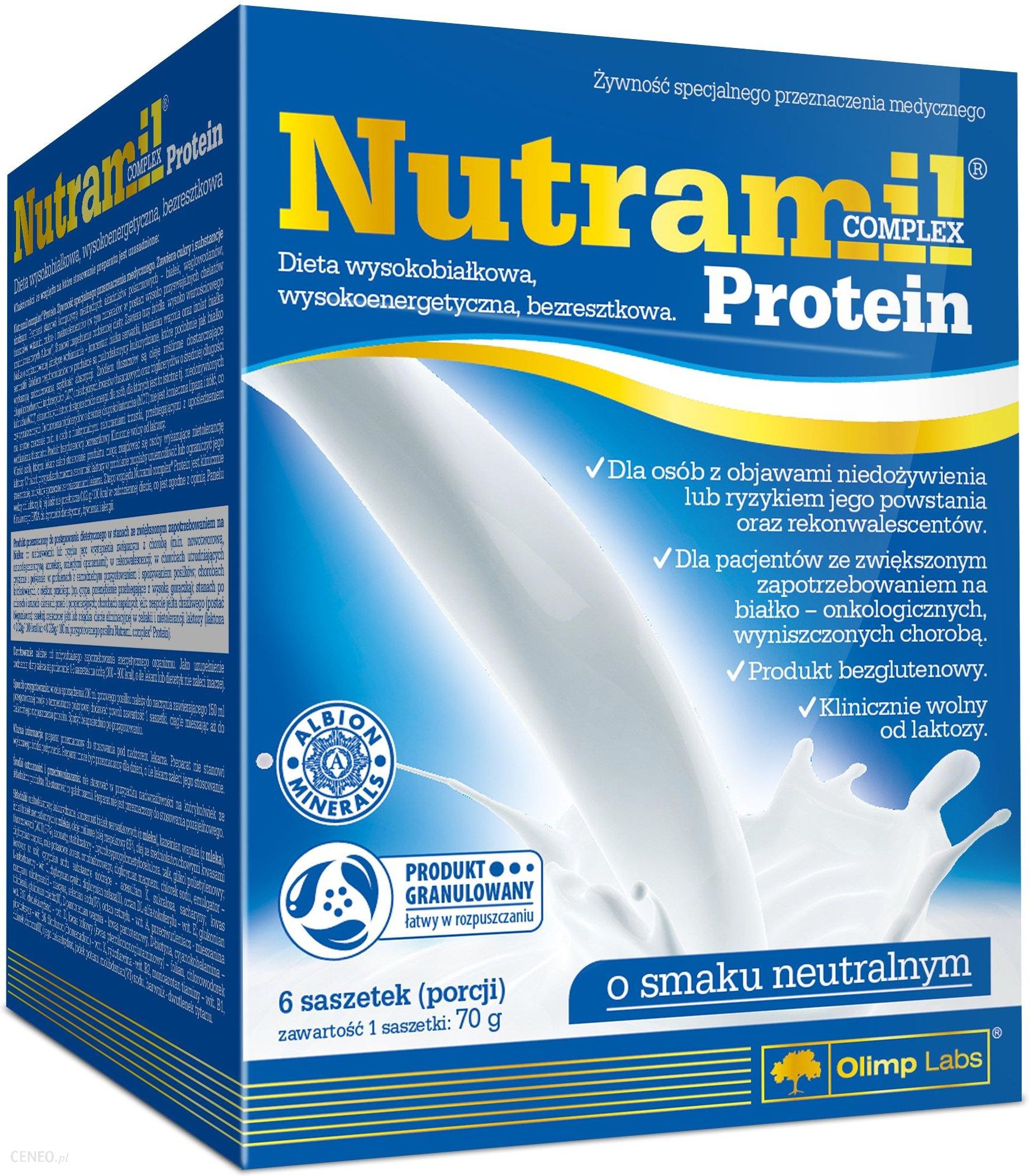 OLIMP NUTRAMIL COMPLEX PROTEINNutramil Complex Protein to wolny od laktozy i glutenu, dietetyczny środek spożywczy specjalnego przeznaczenia medycznego, którego bogata kompozycja składników odżywczych, w tym białek, węglowodanów, tłuszczów oraz witamin i minerałów pozwala na codzienne uzupełnienie diety w wartościowe makro i mikroelementy. W składzie Nutramil Complex Protein mamy więc białko pochodzące z trzech różnych źródeł (koncentrat i izolat białek serwatkowych, kazeinian wapnia) charakteryzujących się zróżnicowaną kinetyką wchłaniania. Dzięki niemu otrzymujemy kluczowy materiał budulcowy w naszym organizmie pomagający w zwiększeniu i utrzymaniu masy mięśniowej. Pokaźną dawkę energii stanowią natomiast węglowodany, źródłem których są maltodekstryny kukurydziane o różnym tempie absorbcji oraz tłuszcze pochodzące z olejów roślinnych (rzepakowego i MCT). Co istotne, Nutramil Complex Protein nie zawiera w składzie błonnika, jest więc doskonałym rozwiązaniem żywieniowym dla osób z problemami jelit. Produkt występujący w trzech smakach (naturalny, waniliowy, truskawowy), oprócz wspomnianego białka, węglowodanów i tłuszczy, pomaga dostarczyć również cennych mikroelementów, w tym minerałów występujących w formie wysoko przyswajalnych i zarazem bezpiecznych chelatów aminokwasowych Albion® (magnez, żelazo, cynk) pozytywnie wpływających na funkcjonowanie organizmu.