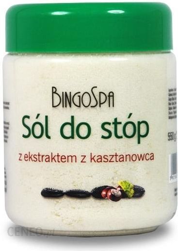 BINGO SÓL DO STÓP Z KASZTANOWCEM 550GSól BingoSpa do stóp ze skłonnościami do pękających naczynek zawiera ekstrakt z kasztanowca – źródło escyny i olejek z drzewa herbacianego mający działanie bakteriobójcze, grzybobójcze, normalizuje również pracę gruczołów łojowych. Olejek działa również przeciwbólowo i ściągająco na pory skóry.Escyna uszczelnia ściany naczyń włosowatych i zwiększa ich przepuszczalność do stanu normalnego dzięki zmniejszeniu kruchości naczyń. Usprawnia się przepływ krwi w naczyniach żylnych, co hamuje krzepliwość krwi i przeciwdziała powstawaniu zakrzepów wewnątrznaczyniowych.Sól BingoSpa do stóp ze skłonnościami do pękających naczynek- uszczelnia drobne naczynia krwionośne i zmniejsza ich widoczność- działa przeciwzapalnie i przeciwobrzękowo- łagodzi podrażnienia skóryZawarte w soli mikroelementy – żelazo, chrom, molibden, miedź – wzmacniają i odżywiają delikatną skórę stóp.Działanie soli BingoSpa potwierdzone zostało badaniami aplikacyjnymi(Badania przeprowadzono w Specjalistycznym Laboratorium Badawczym pod kierownictwem lekarza dermatologa)-zmniejsza widoczność pękniętych naczynek – skuteczność 100%,-zmniejsza skłonność do pękania naczynek – skuteczność 100%,-zmniejsza skłonność do pękania naskórka – skuteczność 90%Badania potwierdziły, że sól BingoSpa jest skutecznym środkiem na pękające naczynka skóry stóp. Sól BingoSpa jest bardzo dobrze tolerowana przez skórę, nie zaobserwowano podrażnień typu: zaczerwienienie, pieczenie, świąd zarówno podczas kąpieli jak i bezpośrednio po jej zakończeniu. Znacząco poprawia ogólny wygląd stóp.90% badanych uznało właściwości soli BingoSpa za lepsze niż innych preparatów o podobnym działaniu.Sposób użycia: do naczynia z letnią wodą wsypać dwie nakrętki soli BingoSpa, dokładnie wymieszać. Moczyć stopy przez co najmniej 15 minut, po skończeniu dokładnie osuszyć. Stosować raz dziennie przez 14 dni.Waga: 550g