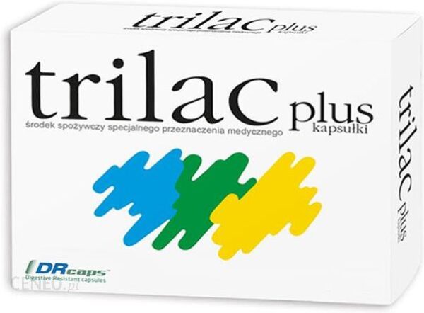 Dietetyczny środek spożywczy specjalnego przeznaczenia medycznegoTrilac Plus to nowoczesny probiotyk z opatentowaną technologią DRcaps w postaci kapsułek rozpuszczalnych w jelitach o powolnym uwalnianiu. Produkt zawiera wyselekcjonowane szczepy żywych kultur bakterii, które dzięki zastosowaniu technologii DRcaps są zabezpieczone przed działaniem niszczących kwasów i enzymów trawiennych w żołądku. Kapsułki DRcaps zapewniają bezpieczne dotarcie szczepów probiotycznych do jelit. Produkt przeznaczony dla niemowląt powyżej 1 miesiąca życia, dzieci i dorosłych.Zastosowanie: do postępowania dietetycznego przy zaburzeniach ze strony przewodu pokarmowego w trakcie i po antybiotykoterapii, wspomagająco przy leczeniu biegunek infekcyjnych również pochodzenia wirusowego, dla zachowania prawidłowej pracy jelit i wspomagania procesu trawienia, przy wystąpieniu tzw. biegunki podróżnych lub profilaktycznie.Zalecana dzienna porcja: w celu uzupełnienia mikroflory jelitowej oraz wspierania pracy układu trawiennego 1 kapsułka dziennie, niemowlęta i dzieci 1 kapsułka dziennie.Sposób użycia: zawartość kapsułki wsypać na łyżeczkę i wymieszać w niewielkiej ilości letniego płynu (przegotowanej wody, mleka lub jogurtu), a następnie podać do wypicia. W przypadku stosowania antybiotykoterapii przygotować i spożyć co najmniej 2 godziny po zażyciu antybiotyku. Najlepiej spożywać z dużą ilością płynu podczas posiłku lub godzinę przed posiłkiem. Po zakończonej kuracji antybiotykowej zaleca się stosowanie Trilac Plus przez 3 tygodnie.Składniki: substancja wypełniająca: glukoza bezwodna, fruktooligosacharydy, liofilizowany szczep Lactobacillus rhamnosus GG (ATCC 53102) w ilości minimum 1,6 mld CFU/kapsułkę, mieszanka liofilizatu 3 szczepów w ilości minimum 1,6 mld CFU/kapsułkę, w proporcji: Lactobacillus acidophilus 46,5%, Bifidobacterim lactis 47,5%, Lactobacillus delbruecki subs.bulgaricus 6%, stabilizator: kwas L-askorbinowy, substancja zagęszczająca: hypromeloza, guma gellen (E418), barwnik: dwutlenek tytanu (E171).100g zawiera:- wartość energetyczna 1324kJ/314,4kcal;- tłuszcz 0g; węglowodany 66,60g w tym cukry 66,60g; błonnik 24g; białko 0g.1 kapsułka zawiera:- wartość energetyczna 3,97kJ/0,94kcal;- tłuszcz 0g; węglowodany 0,19g w tym cukry 0,19g; błonnik 0,07g; białko 0g; liofilizowany szczep Lactobacillus rhamnosus GG (ATCC 53102) 1,6 x 10^9 CFU; mieszanka liofilizatu 3 szczepów w proporcji: Lactobacillus acidophilus 0,74 x 10^9 CFU, Bifidobacterim lactis 0,76 x 10^9 CFU, Lactobacillus delbruecki subs.bulgaricus 0,1 x 10^9 CFU.Ważne wskazówki:Produkt przyjmowany pod nadzorem lekarza.Nie jest odpowiedni jako jedyne źródło pożywienia.Produkt nie jest przeznaczony do stosowania pozajelitowego.Nie stosować w przypadku nadwrażliwości na którykolwiek ze składników preparatu.Chronić przed światłem.Przechowywać w temperaturze poniżej 25 stopni Celsjusza, w suchym miejscu, w sposób niedostępny dla dzieci.Nie należy przekraczać zalecanej porcji do spożycia w ciągu dnia.Utrzymanie prawidłowego stanu zdrowia wymaga zrównoważonego odżywiania i prowadzenia zdrowego trybu życia.